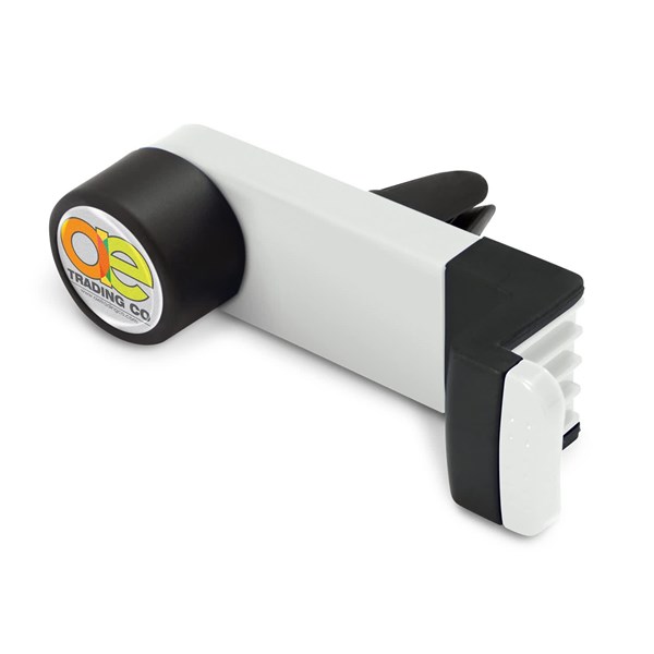 Spring-loaded phone holder with a soft PVC clip which pushes onto car air vents and securely holds a phone so it can be seen by the driver and used as a GPS.