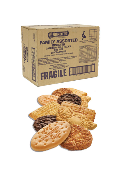 - This 3 kg pack of Arnott's Family Assorted Biscuits is perfect for stocking up your home or office cupboard