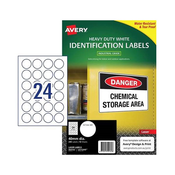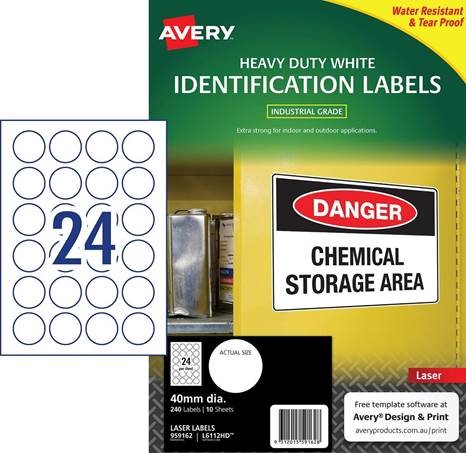 - Avery White Round Heavy Duty Multi-purpose Labels are a robust solution to the toughest home organisation! These durable heavy duty labels are oil, dirt, UV resistant and unaffected by temperature (between -20 to + 80 Deg C)