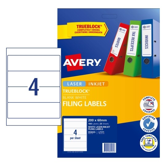 Avery Laser Labels L7171 Lever Arch 200X60mm White 4Up Pack 25
