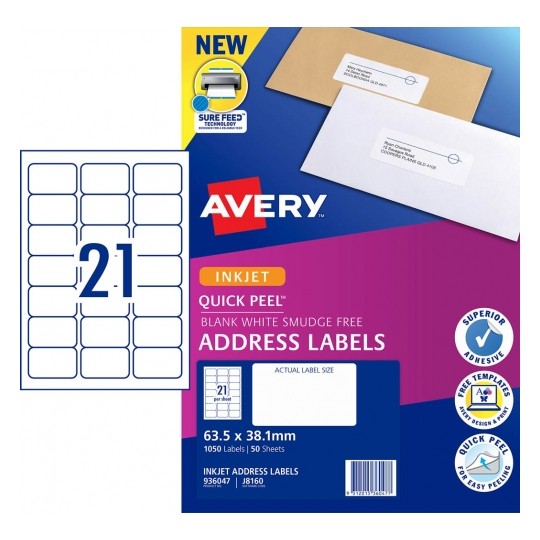Avery Quick Peel Address Labels Sure Feed J8160 63.5X38.1mm 21Up Bx 50
