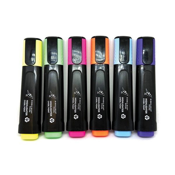 - Six fluorescent water-based ink highlighters