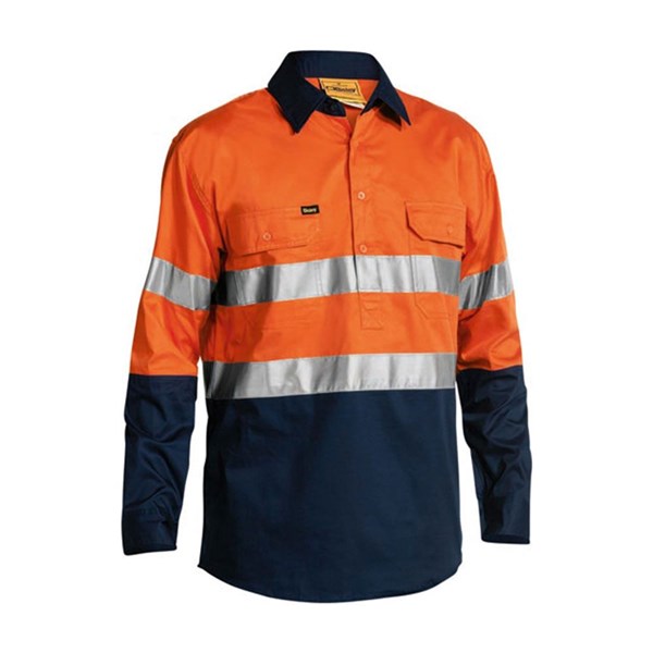 Bisley BSC6896 Hi-Vis Closed Front L/Sleeve Cool Taped Cotton Shirt 155gsm Orange/Navy