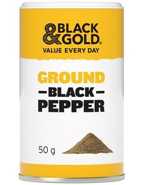 - Black & Gold Ground black pepper available in a simple and storage friendly container with sprinkle and pour options.