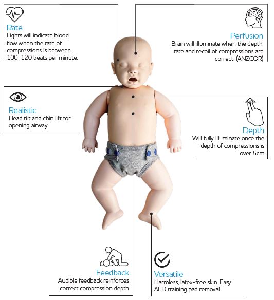 - Developed with help from leading European experts in the field of infant resuscitation, Brayden Baby CPR Manikin’s unique features include intuitive lights that provide real-time feedback for ventilation training and lights providing real-time feedback for chest compressions (depth, rate, recoil and finger/thumb position).