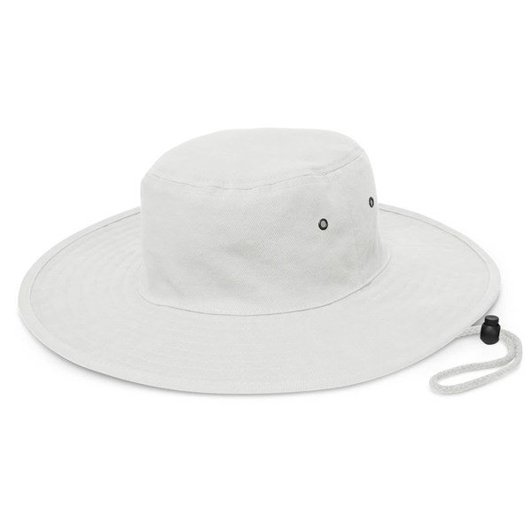 Popular wide brim sun hat which is made from cotton twill The hat's material provides excellent UPF50 protection from the sun and is available in three sizes, including a child's size. It features a sweatband, smart gunmetal eyelets and a woven chin strap which has a breakaway safety clip and a sliding adjustment toggle.