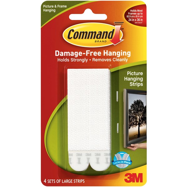 - Command™ Large Picture Hanging Strips hold up to 7.2kg per 4 sets for frames sized 60cm x 90cm