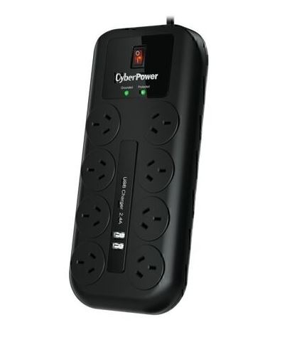 - CyberPower CPSURGE08USB-ANZ is ideal for expensive home theatre system and audio/video devices protection. MOV technology guards the surge suppressor and connected electronics such as phone, network, and communication equipment against surge/spikes.