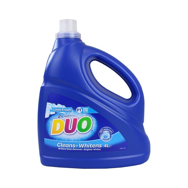 Keep your whites bright and fresh with Duo Laundry Detergent. This powerful concentrated formula features an Opti-Brightener system that breaks down stains and lifts out dirt while leaving your clothes with the clean, fresh fragrance of pure white linen after every wash.