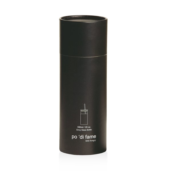 High borosilicate glass bottle|Bespoke natural bamboo push on lid|Easy grip protective coloured silicone sleeve|Colour matching PP straw|BPA Free|Supplied: in a black po ‘di fame presentation tube (25.5cm H x 9cm Dia.)|Capacity: 590ml