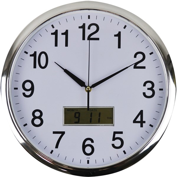 Italplast Wall Clock 36cm Lcd Date And Month Chrome Frame White Face