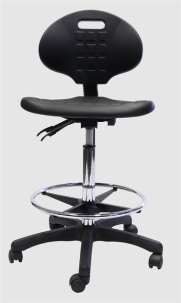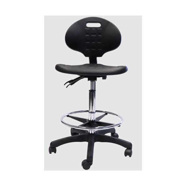- Laboratory drafting stool with a moulded polyurethane seat pan and back rest, contoured waterfall seat and infinite tilt lock for complete sitting adjustment