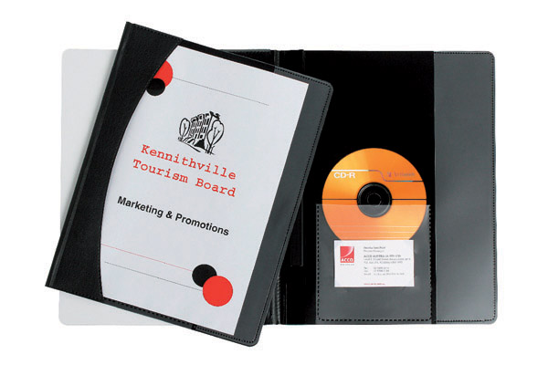- Inside back cover with vertical pocket, CD holder and business card holder