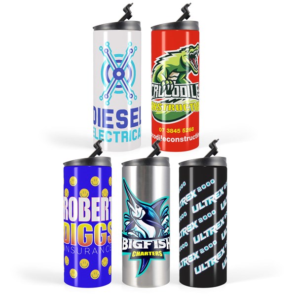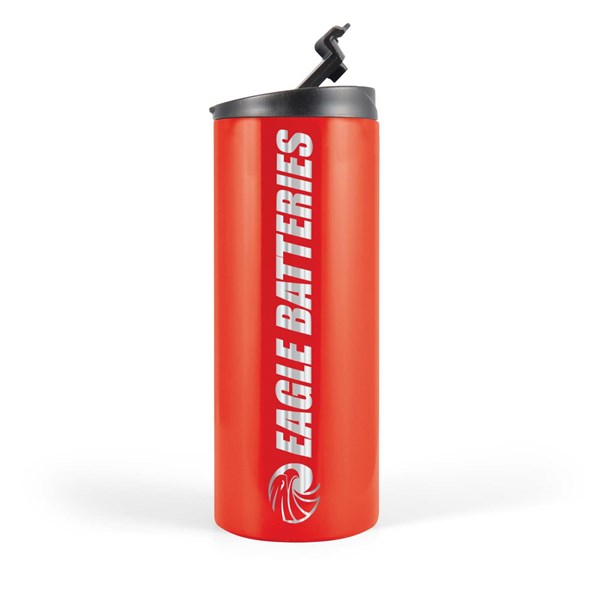 Introducing the Ninja Coffee Cup: a 350ml double-walled stainless steel vacuum cup with a secure screw lid and flip-up tab featuring a silicone seal. Available in five colours, this cup keeps drinks hot or cold for up to 6 hours. Its slim design fits car cup holders. For logo longevity, hand washing is recommended. Not suitable for carbonated liquids or freezing.