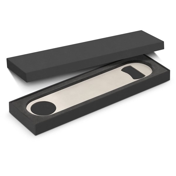 Classic stainless steel bottle opener which is presented in a black gift box.