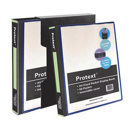 - Protext fixed pocket display book comes with 60 pockets, an insertable cover and spine with PP box