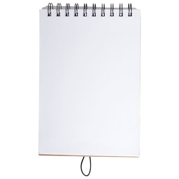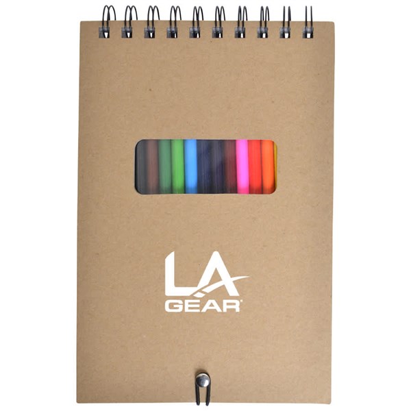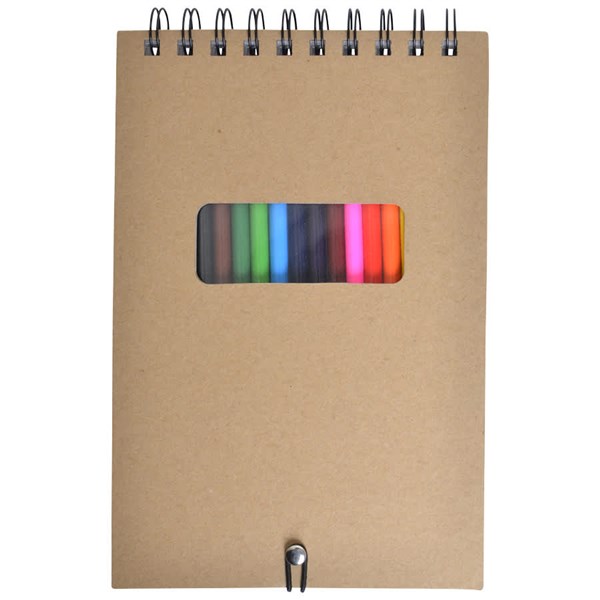Recycled cardboard spiral flip drawing pad with 50 sheets of plain paged paper and 12 coloured pencils (light green, black, brown, orange, pink, maroon, blue, purple, green, yellow, red, light blue) in resealable vinyl case. Pencils are lead free.