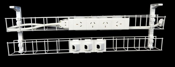Manage your wiring under desk with a cable basket. The dual basket takes both power and data, and can connect to power coming from the wall or ceiling.