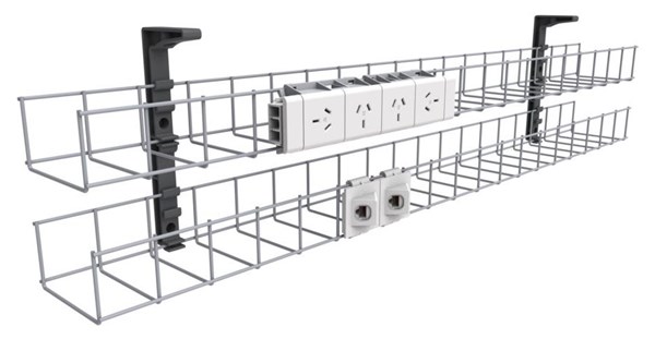 Manage your wiring under desk with a cable basket. The dual basket takes both power and data, and can connect to power coming from the wall or ceiling.