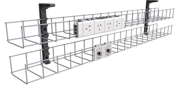Manage your wiring under desk with a cable basket. The dual basket takes both power and data, and can connect to power coming from the wall or ceiling.
