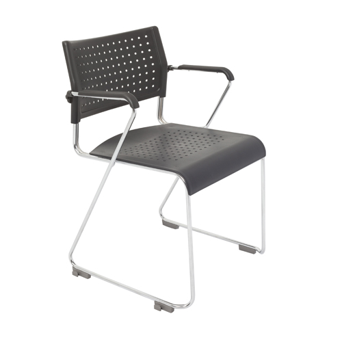 Very versatile chair with fixed arm rests, black plastic perforated back and waterfall seat and chrome steel rod sled base. The chair stacks and links and has options for a fabric seat or back pad.
