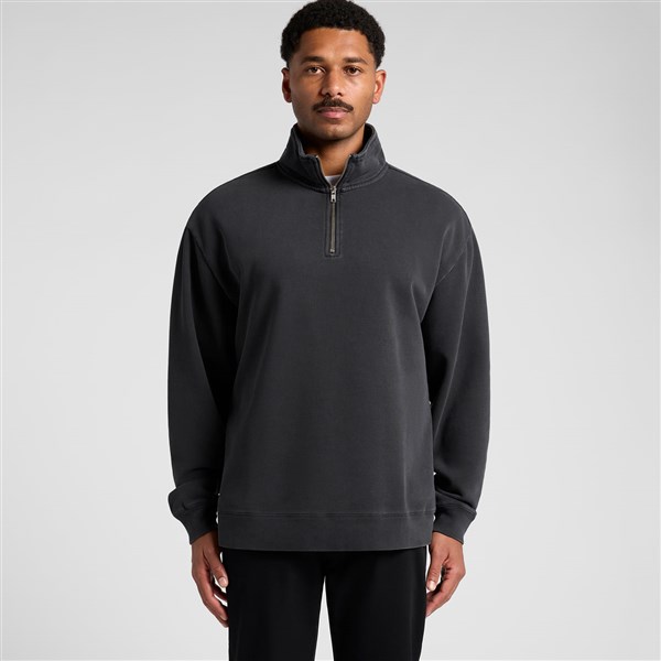 Introducing the Relax Faded Half Zip, a relaxed fit top made from mid-weight 320 GSM fabric with 80% cotton and 20% recycled polyester. It features a garment dyed finish, mock neck, silver SBS half zip, and ribbed cuffs and hem.