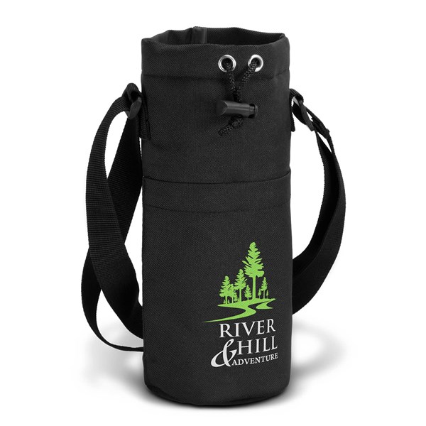 Convenient bottle sling bag constructed with 600D polyester and PEVA foam for cooling insulation. It features a front pocket, adjustable strap, and plastic puller with a cord top.