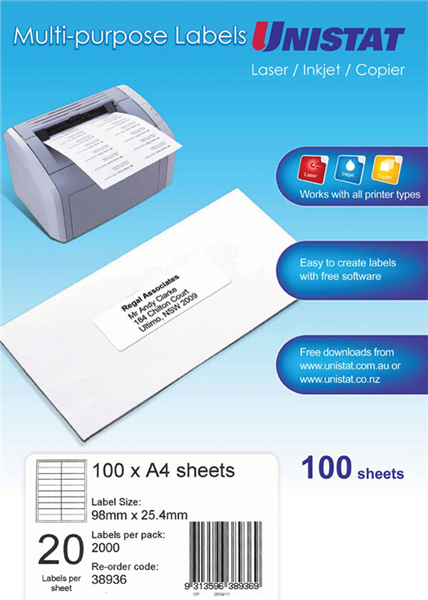 Unistat Labels 38936 Multi Use A4 20Up 98 X 25.4mm White Box 100