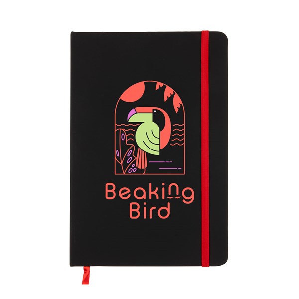 Introducing our stylish A5 size Notebook, designed to keep your notes organised in style! It features a coloured elastic retaining closure and a matching ribbon page marker for easy bookmarking. With 96 leaves and 192 lined cream pages (70GSM), there's plenty of space for all your writing needs. Available in 13 vibrant colours, you can choose the perfect one to match your style or brand. Customise it further with your logo or design using our scr