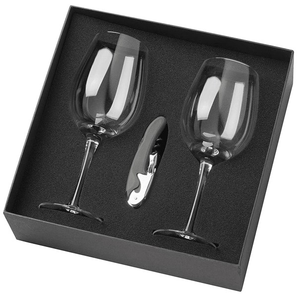 Two piece wine glass set with waiters friend. Supplied in a classy two part gift box with foam insert. 430ml capacity.