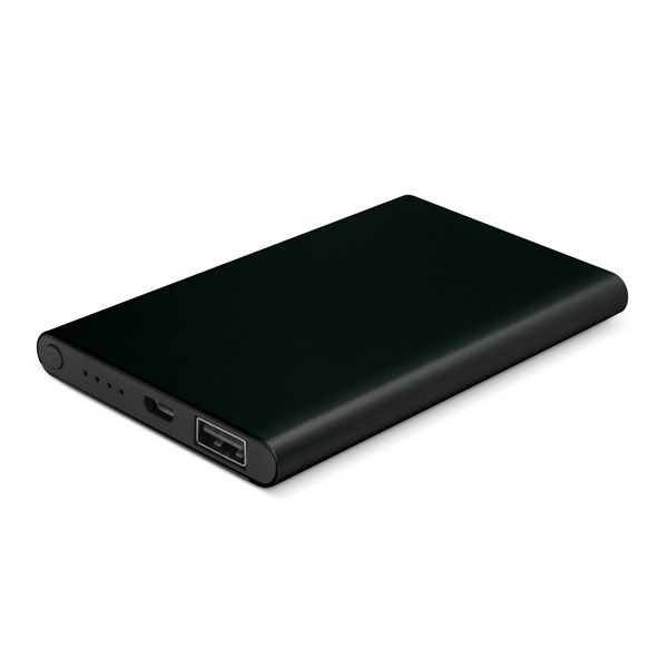 Thin 4000mAh power bank with a power gauge and a smart aluminium finish. The input power is 5V/1 Amp and the output power is 5V/1 Amp. It can be recharged in 5-6 hours from a USB port or a mains adapter. Comprehensive instructions and a Micro-B USB cable are included. An optional EVA carry case and a triple connector cable are available on request. Zion laser engraves to an oxidised white colour.